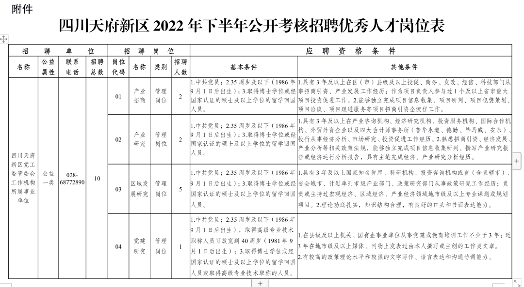 四川天府新区党工委管委会工作机构所属事业单位拟面向社会公开考核招聘工作人员共10名。本次公开招聘进入事业单位的为编制内正式工作人员。
