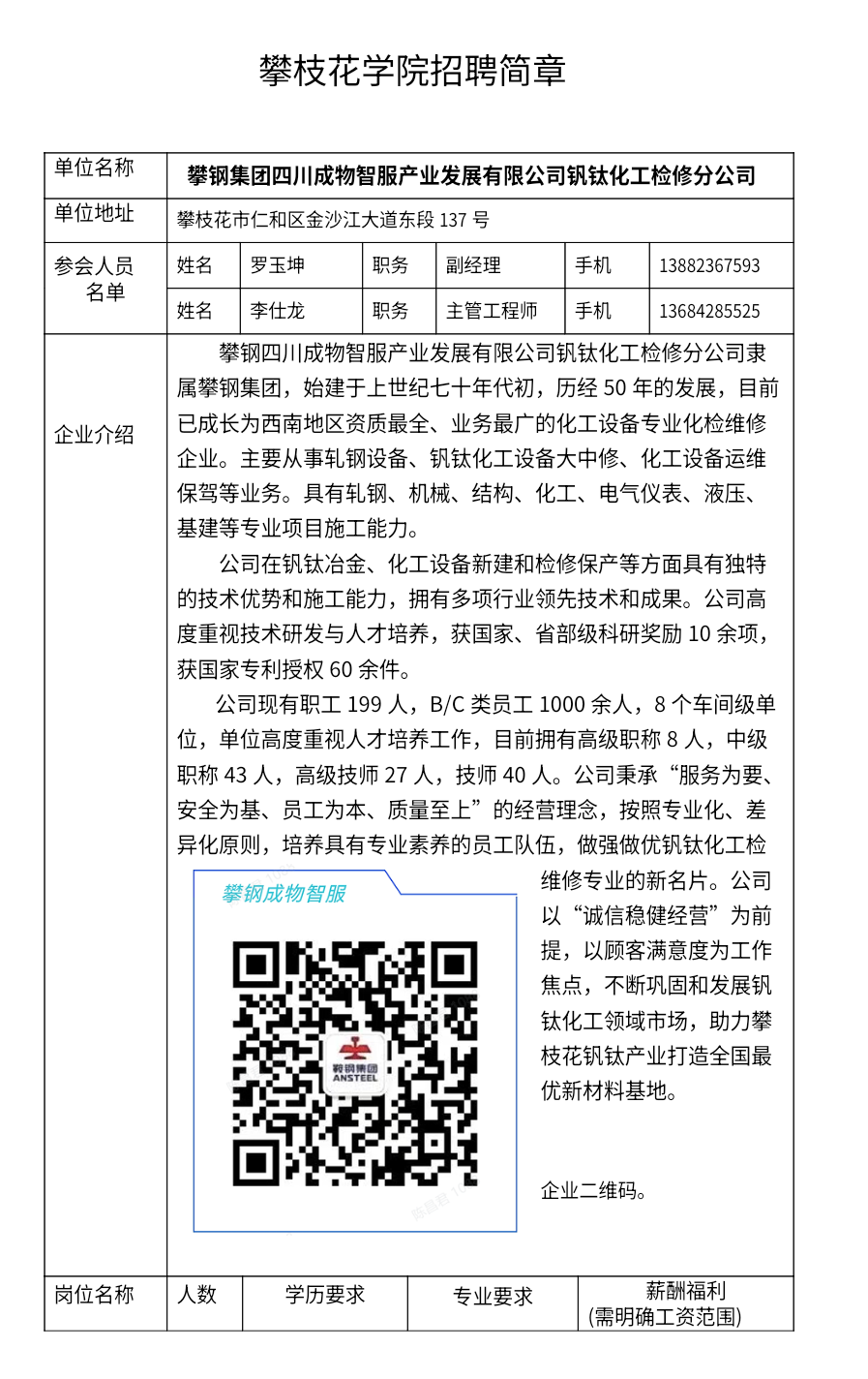 攀钢集团四川成物智服产业发展有限公司钒钛化工检修分公司招聘简章