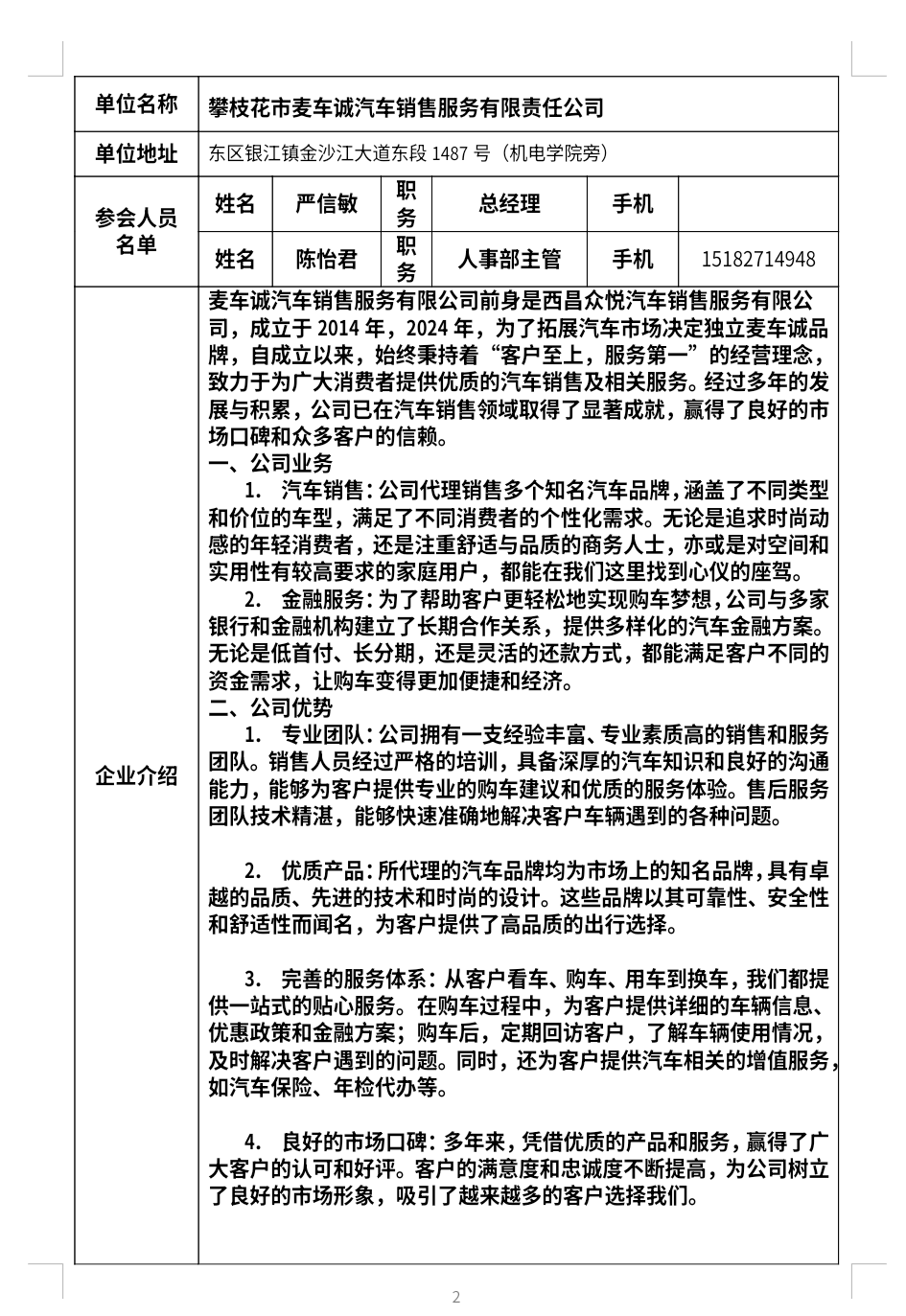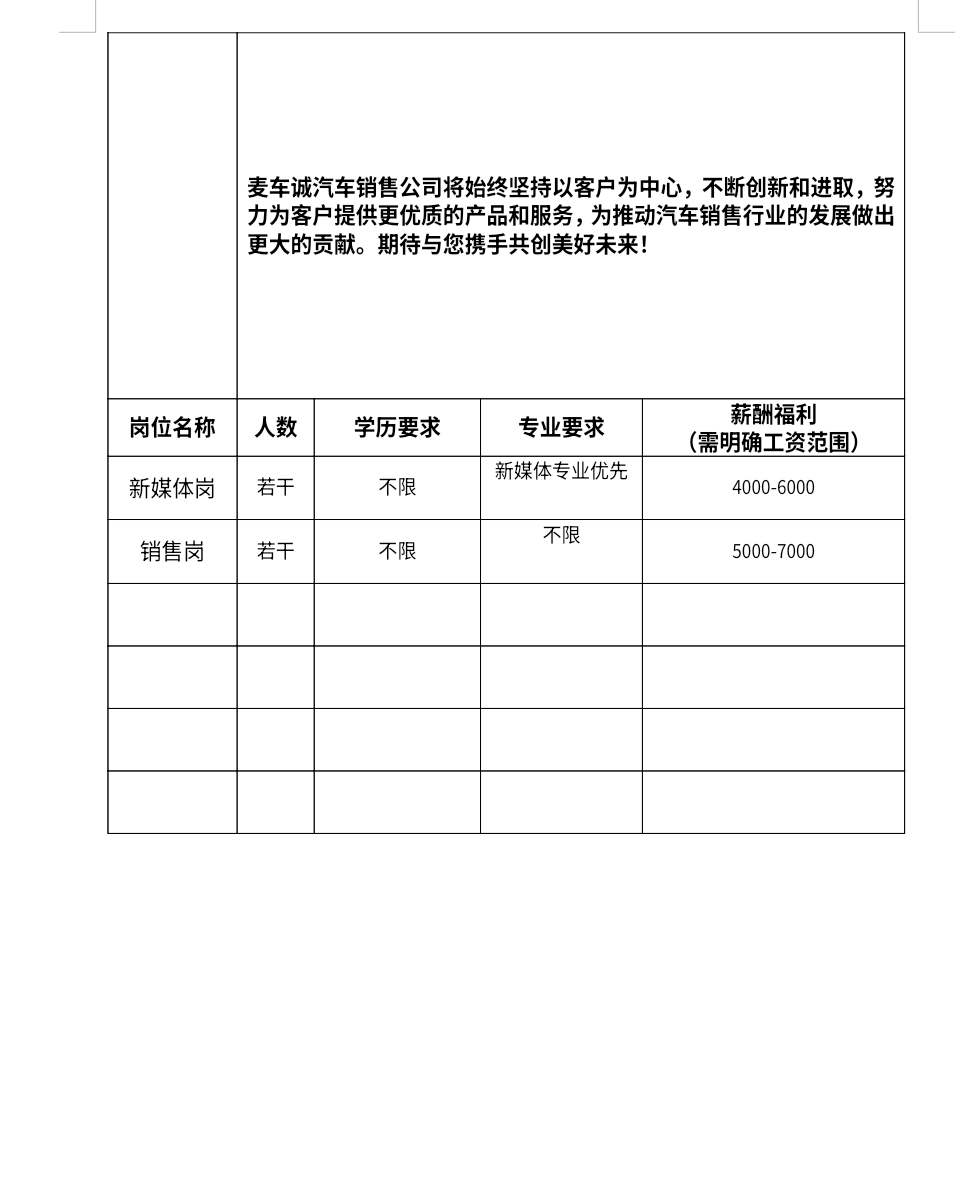 攀枝花市麦车诚汽车销售服务有限责任公司招聘简章