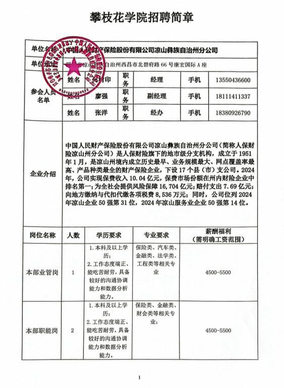中国人民财产保险股份有限公司凉山彝族自治州分公司招聘简章