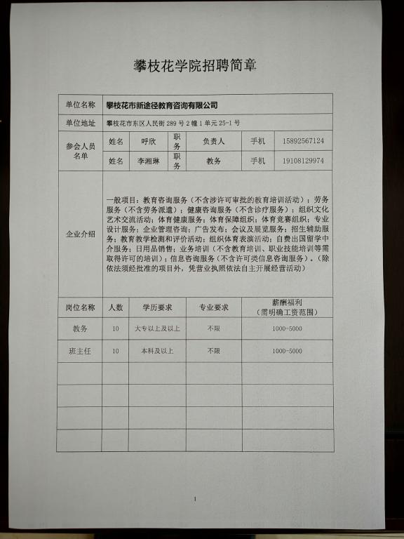 攀枝花市新途径教育咨询有限公司招聘简章
