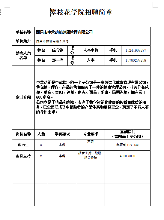 西昌市中营动能健康管理有限公司招聘简章