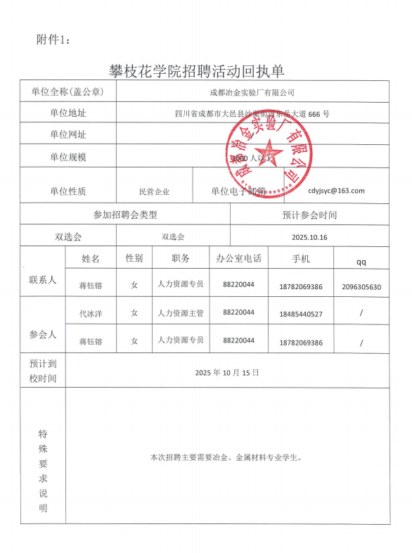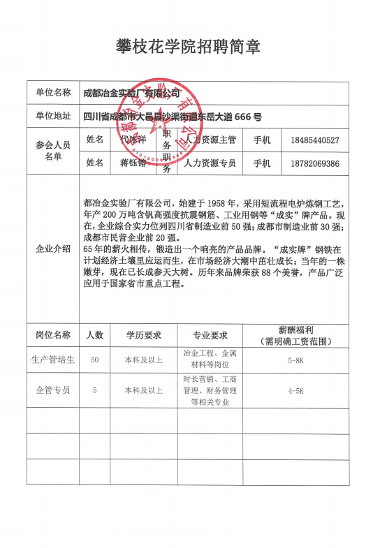 成都冶金实验厂有限公司招聘简章