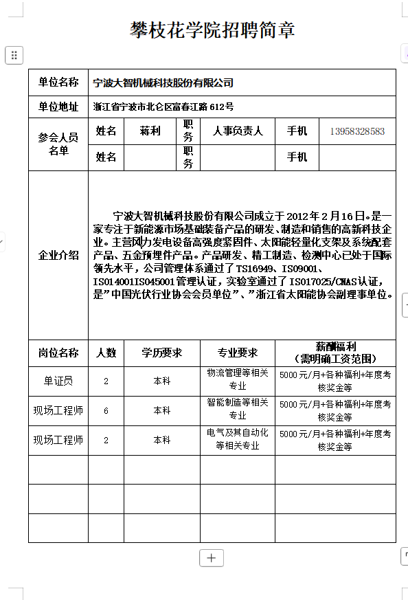 宁波大智机械科技股份有限公司招聘简章