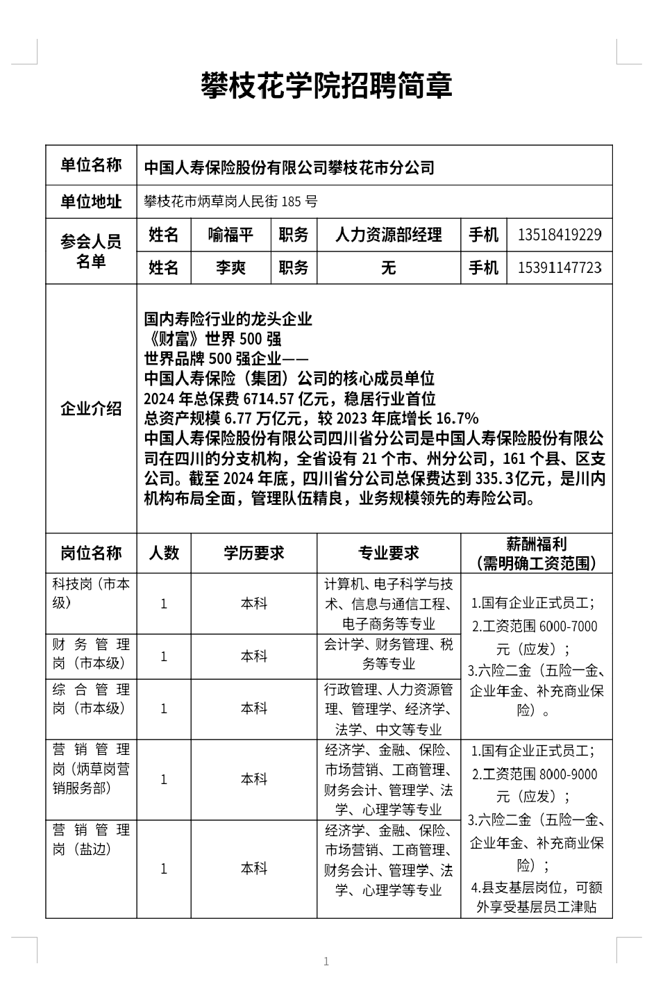 中国人寿保险股份有限公司攀枝花市分公司招聘简章